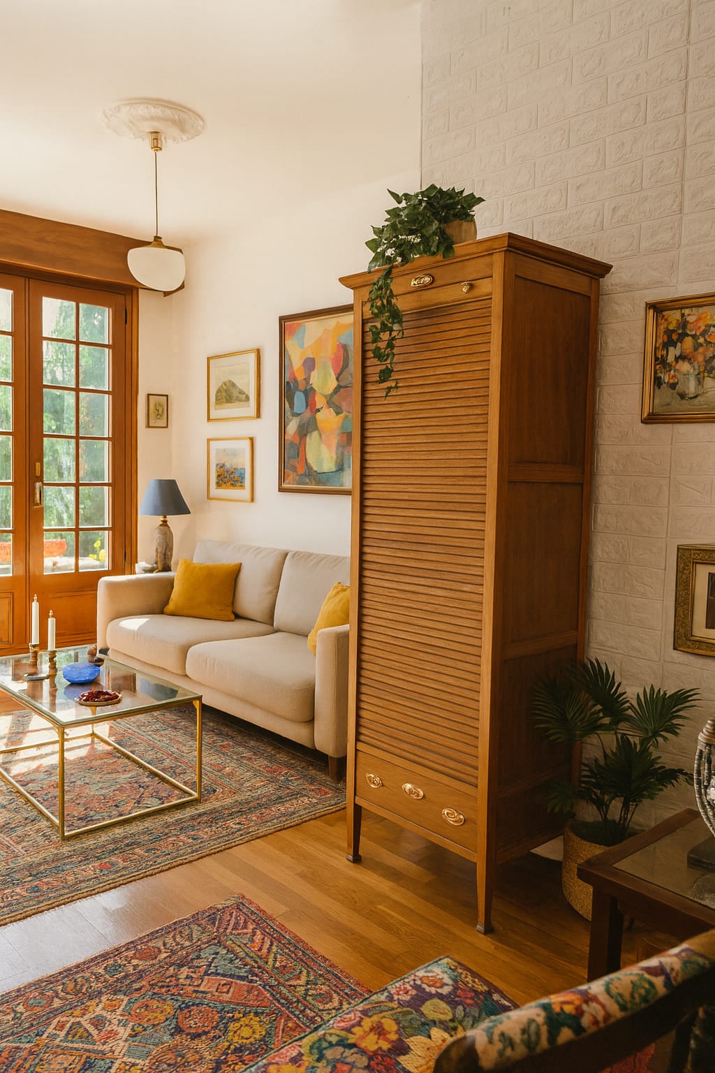 Descubre esta pieza única de mobiliario vintage: un archivador antiguo de persiana en roble macizo, completamente restaurado y listo para seguir escribiendo historia en tu hogar o espacio de trabajo.