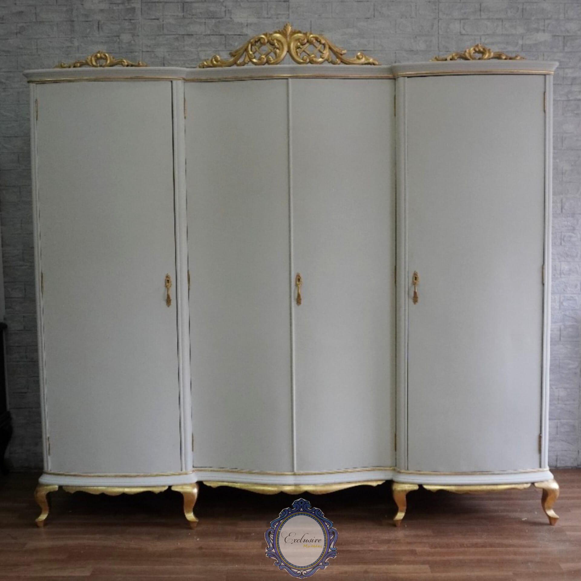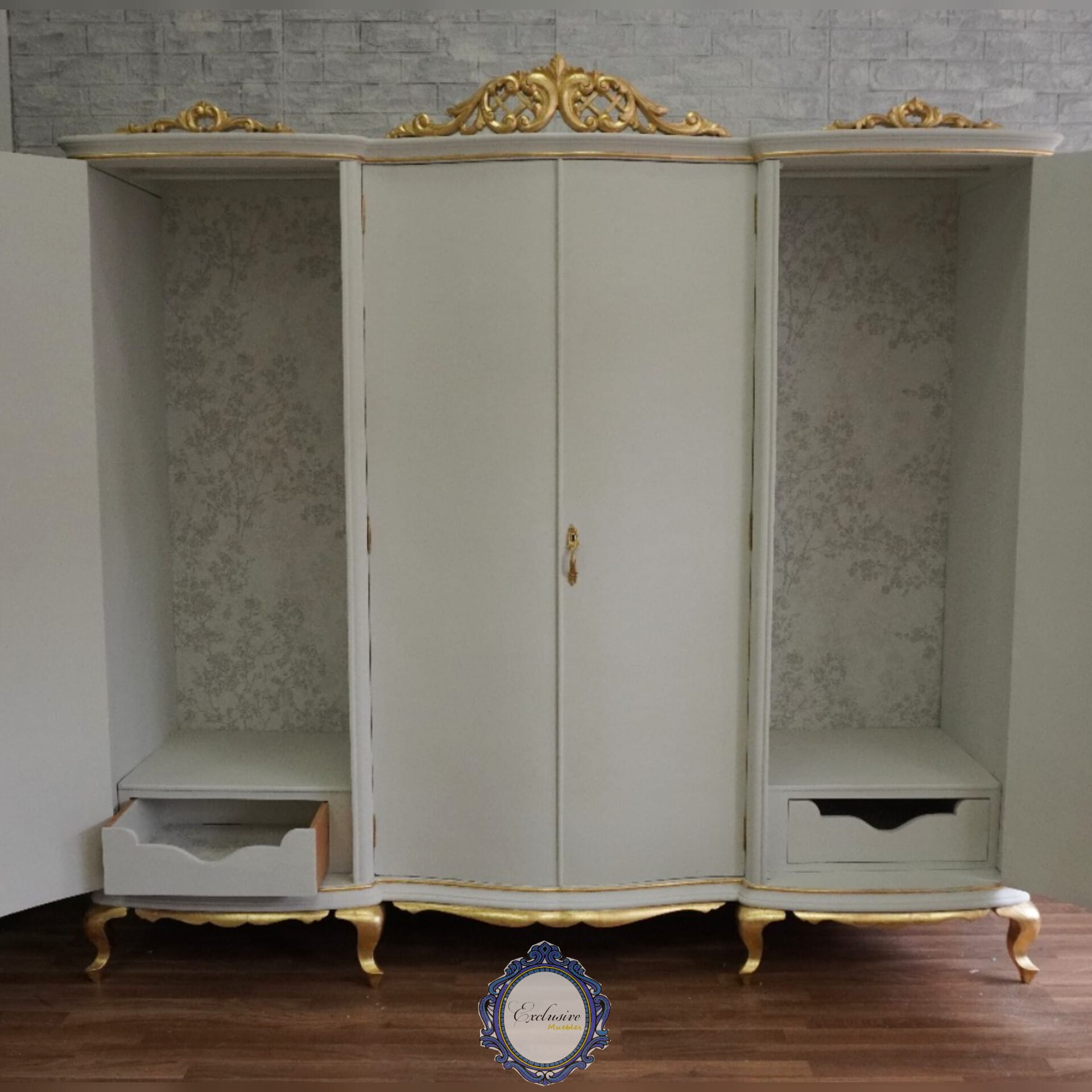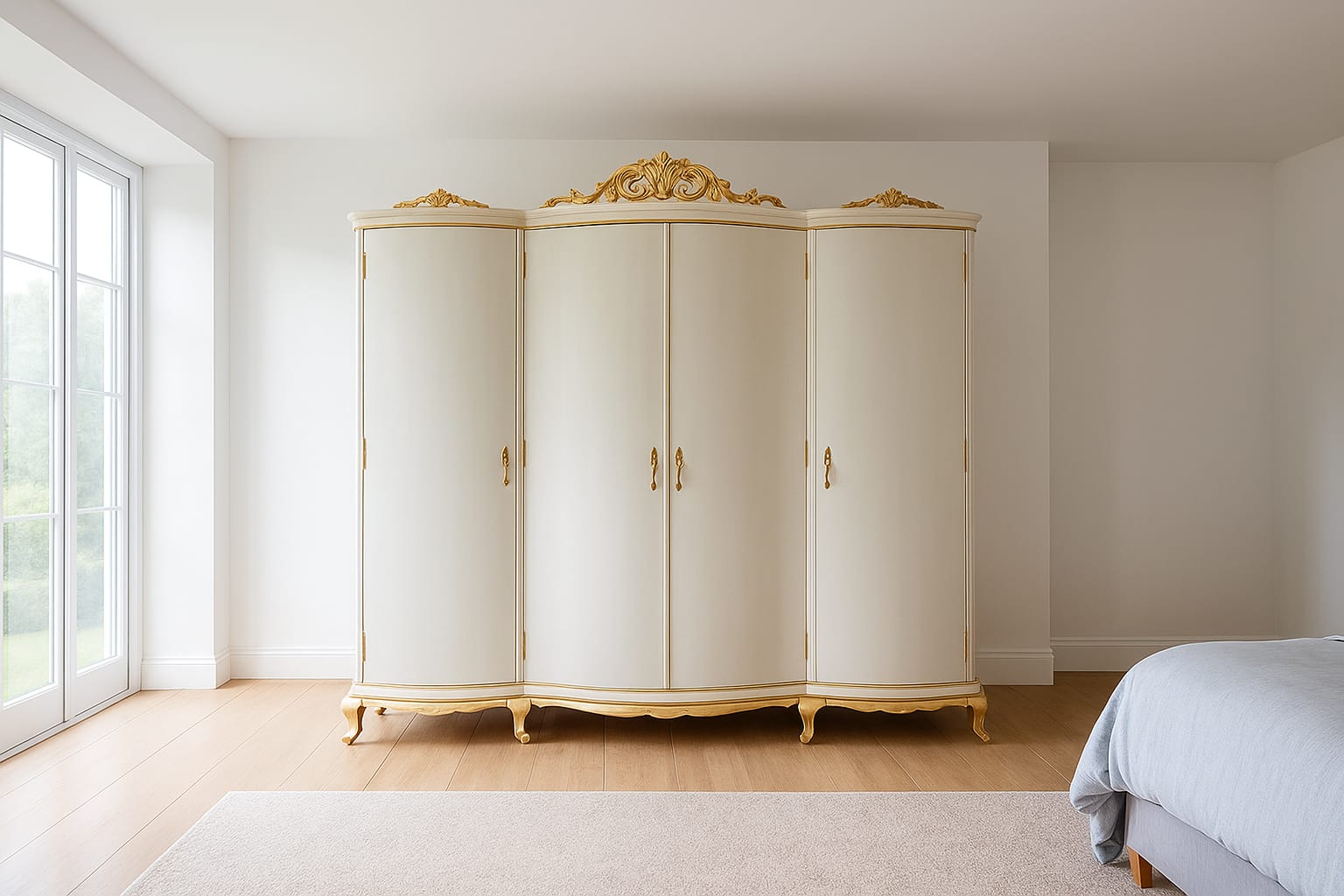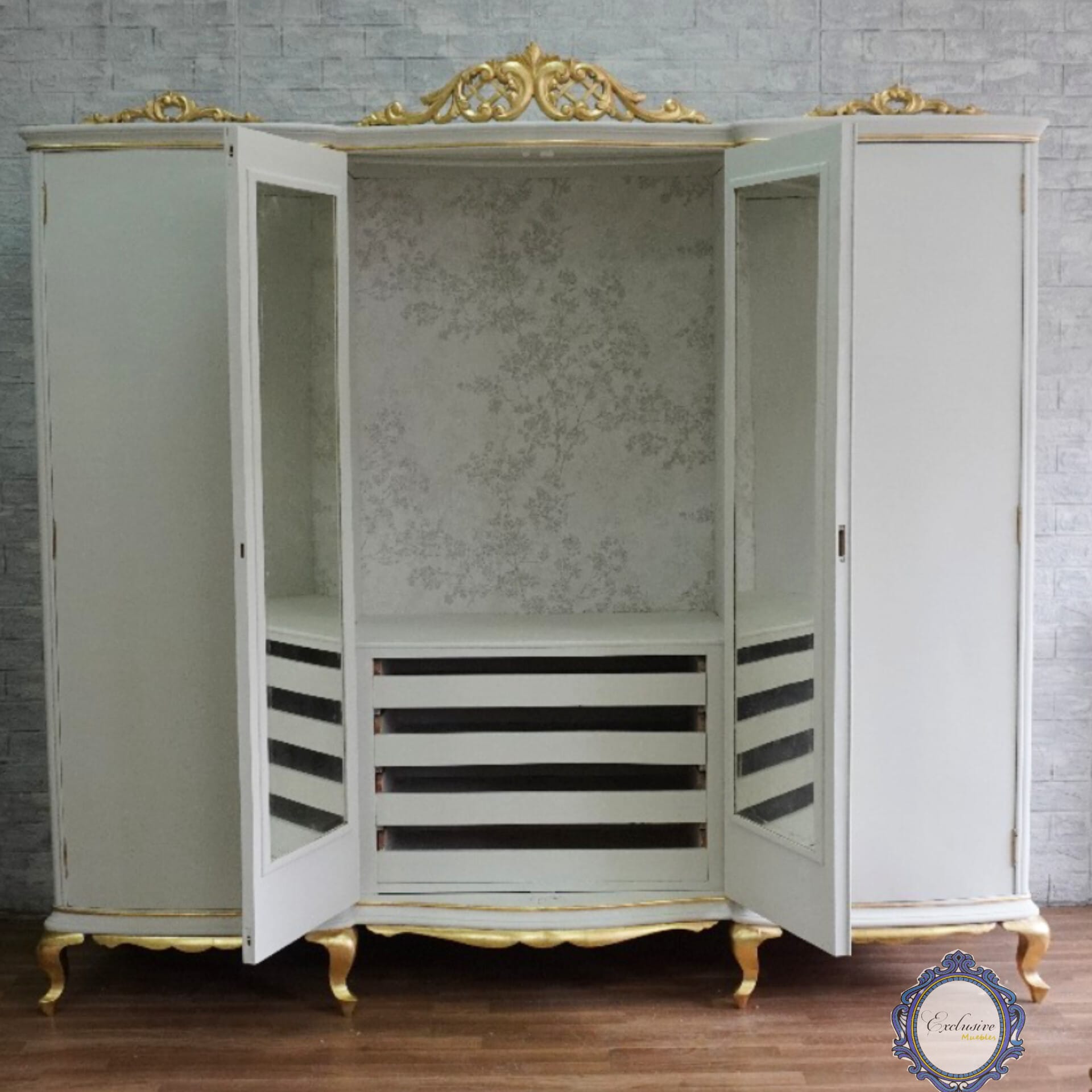 Precioso Armario restaurado de forma artesanal, acabado en un blanco roto suave que aporta luz y frescura al espacio. Las molduras trabajadas con hoja dorada añaden un punto de distinción, creando un equilibrio perfecto entre clasicismo y estética contemporánea.