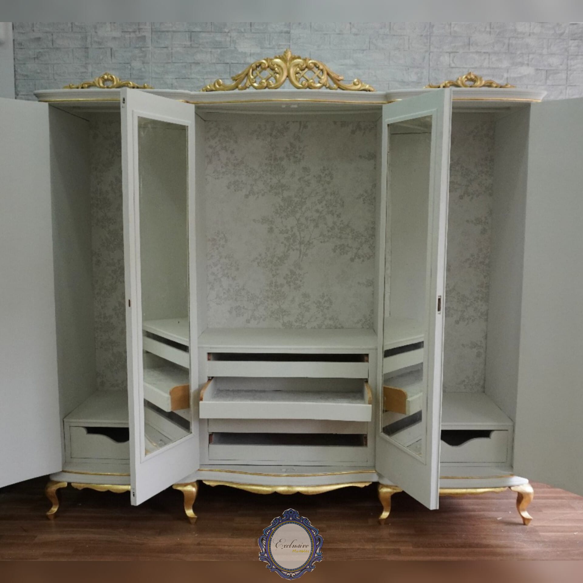 El armario consta de 3 módulos, donde encontraremos, un cajón en cada modulo lateral, y 4 cajones en el módulo central.